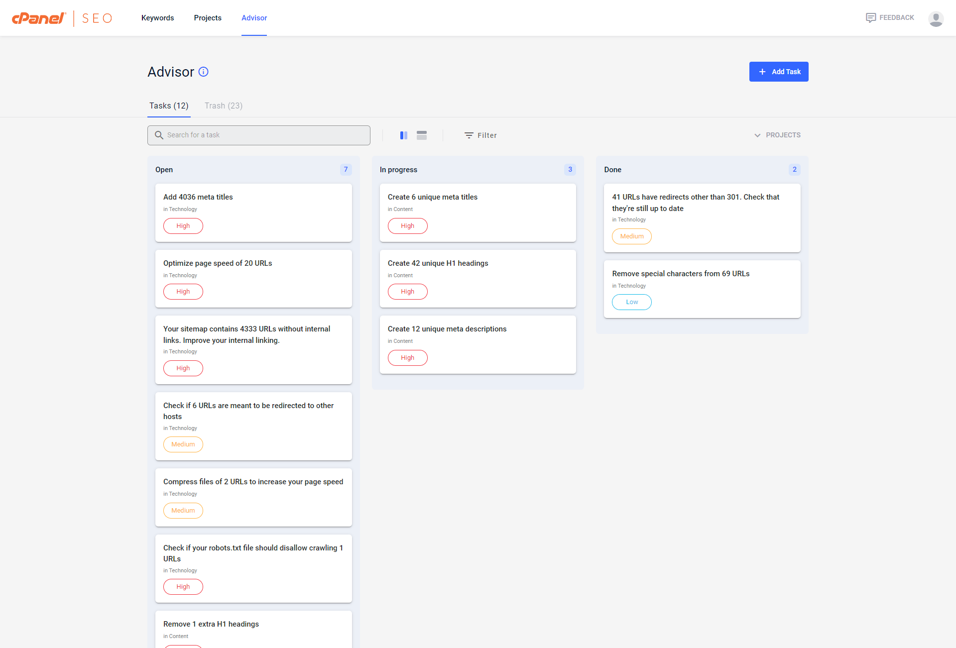The second reason is that the Advisor is automatically updated based on the results of automated weekly Site Audits. In other words, if a Site Audit identifies any issues concerning a task you completed in the past, it will automatically be updated and pop up in the Open section.