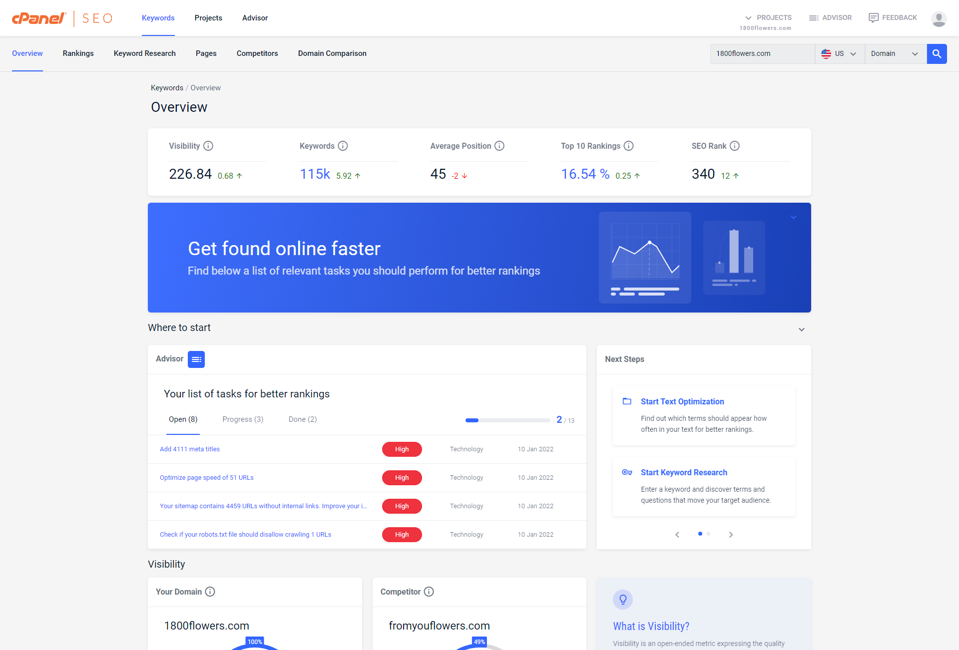 cPanel SEO was designed to provide immediate value for your personal website or your clients’ sites, from an initial site audit through recommendations to improve your search engine results.
